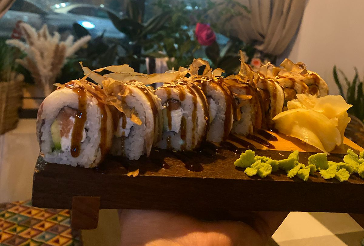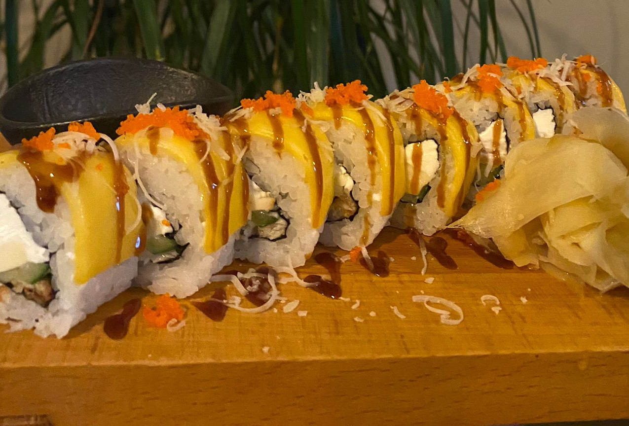 Состав: рис, нори, копчёный угорь, лосось, сливочный сыр, авокадо, соус унаги.