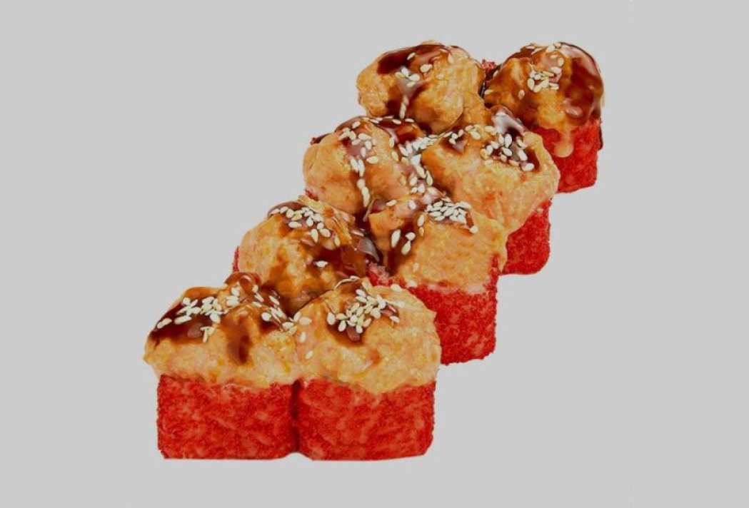 Состав: рис, нори, опалённый лосось, копчёный угорь, сливочный сыр, темпурная крошка, омлет, тобико, огурцы, соус унаги, кунжут.