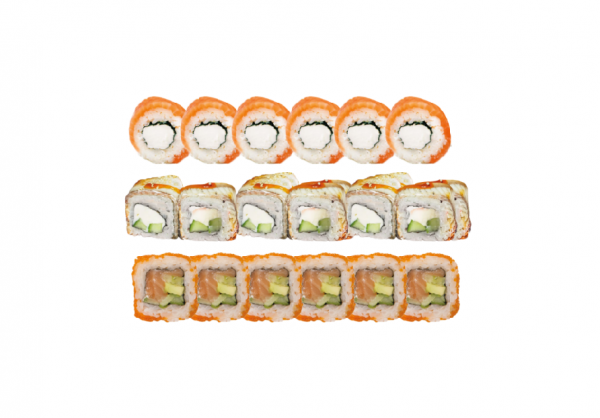 Ролл Филадельфия классик, ролл калифорния с крабом, ролл запечённый Лава с креветками, ролл запечённый с крабом