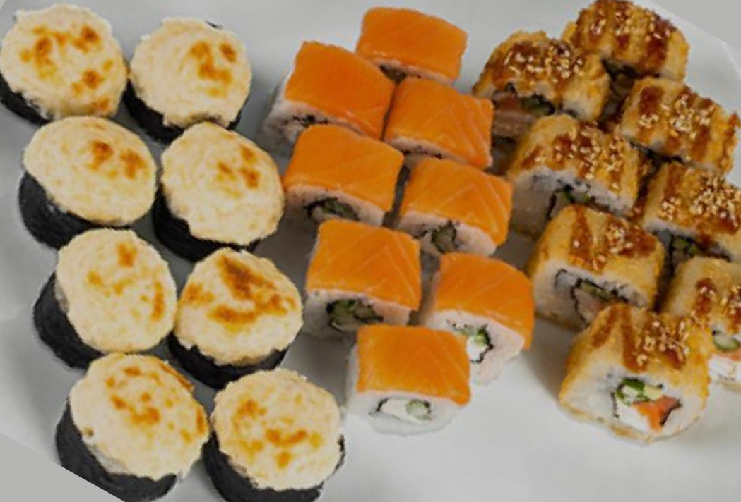 Запечённый восток, Оранж краб, Бонито с лососем, Запечённый люкс с угрем, Ролл с огурцом